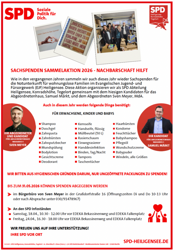 Wie in den vergangenen Jahren sammeln wir auch dieses Jahr wieder Sachspenden für die Notunterkunft für wohnungslose Familien im Evangelischen Jugend- und Fürsorgewerk (EJF) Heiligensee. Diese Aktion organisieren wir als SPD Abteilung Heiligensee, Konradshöhe, Tegelort gemeinsam mit dem hiesigen Kandidaten für das Abgeordnetenhaus, Samuel Märkt, und dem Abgeordneten Sven Meyer, MdA.